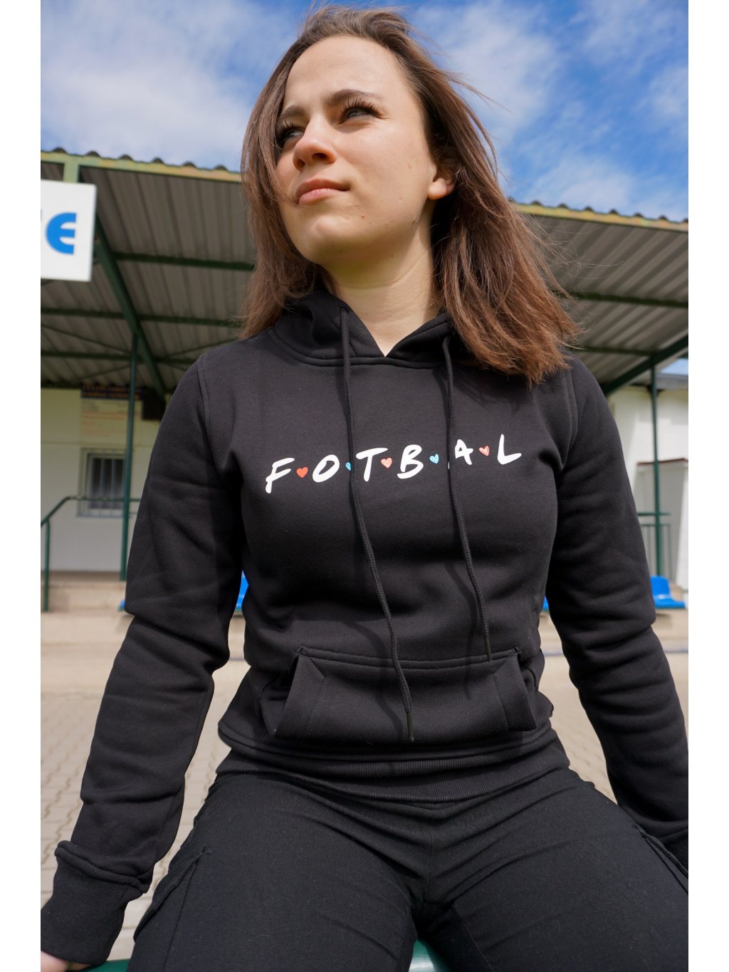 Černá mikina z velmi pohodlného materiálu, s potištěným motivem FOTBAL na prsou, který je tvořen ikonickým fontem a srdíčky. Mikina má kapuci a klokaní kapsu.