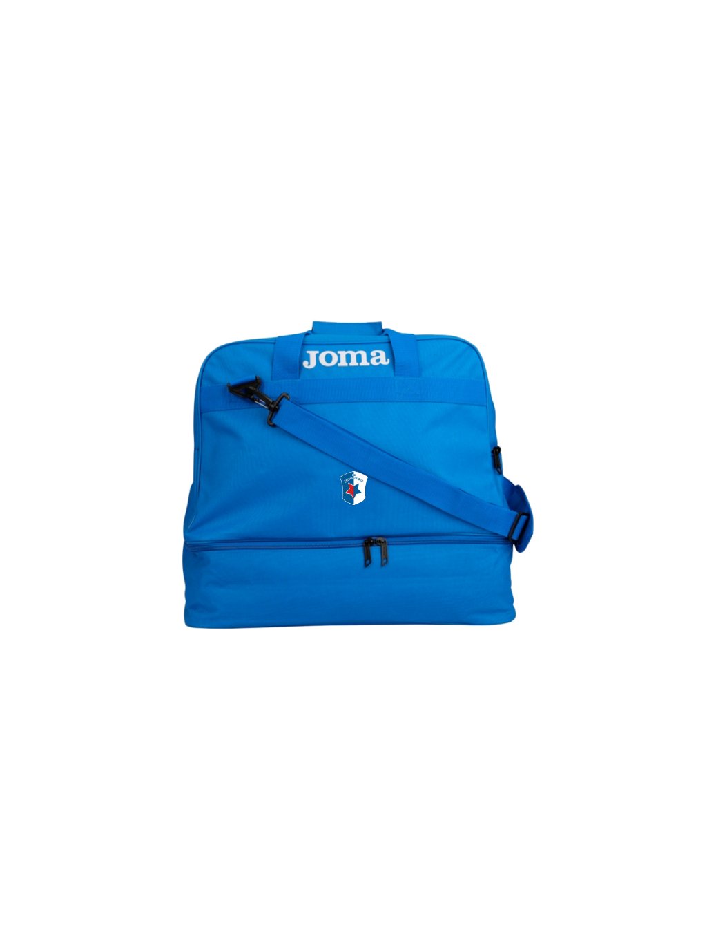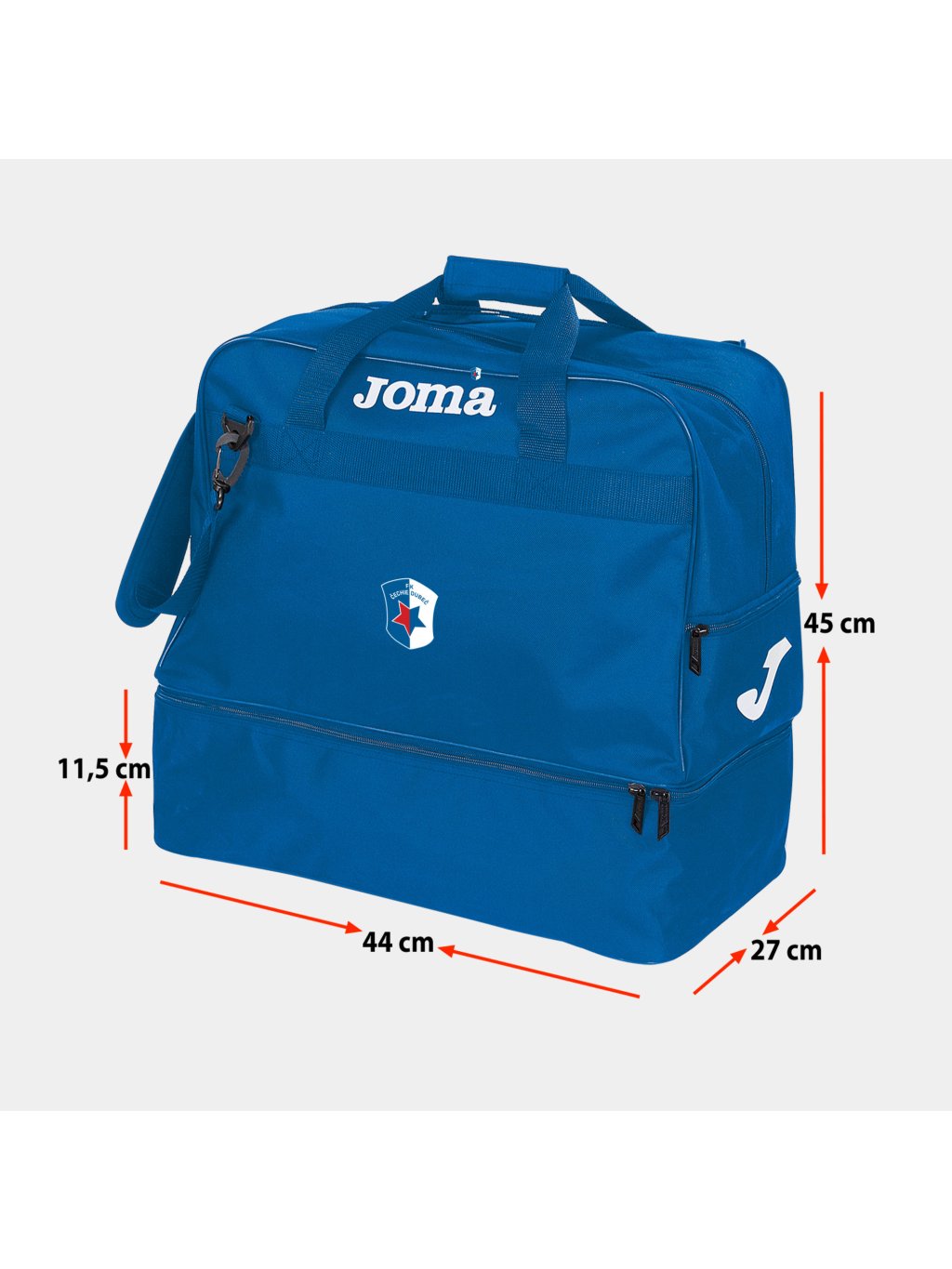 Sportovní taška JOMA Training III s 1 hlavní kapsou na zip, postranní kapsičkou na zip a spodní přihrádkou na kopačky, nastavitelný ramenní popruh. Objem: 40 l, rozměry: 45 x 44 x 27 cm. Na přední straně potisk loga FK Čechie Dubeč.