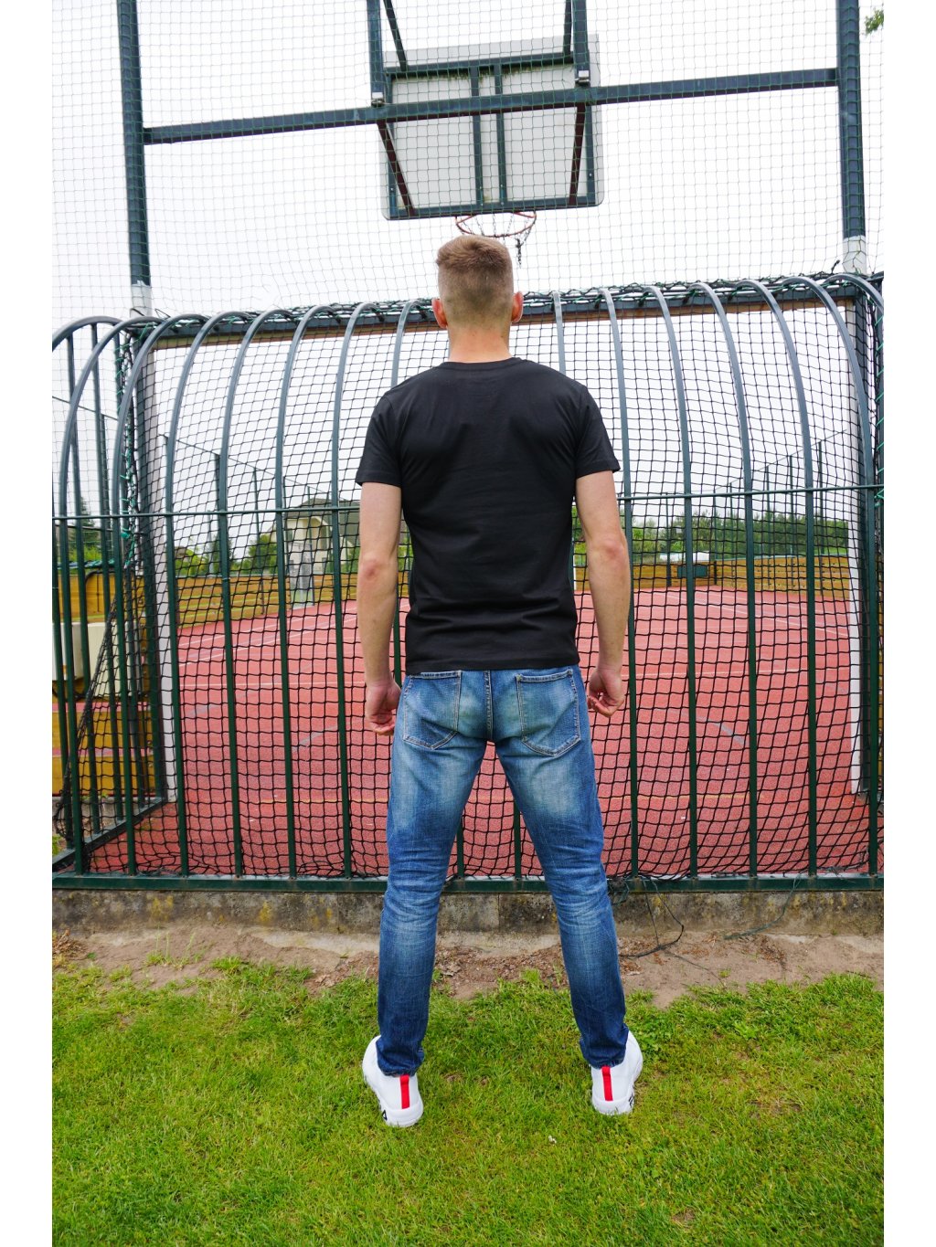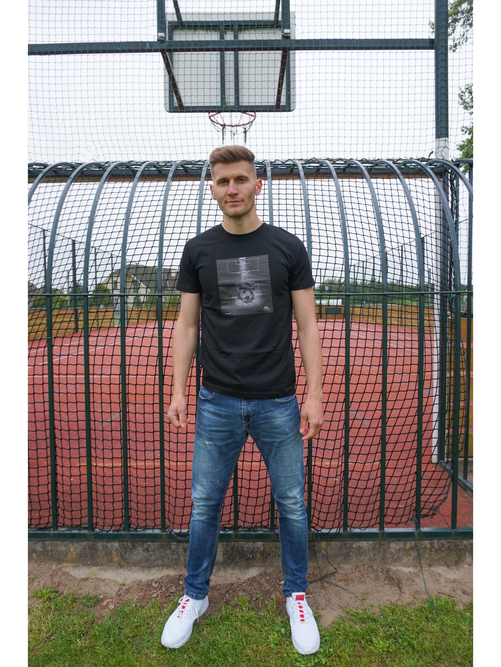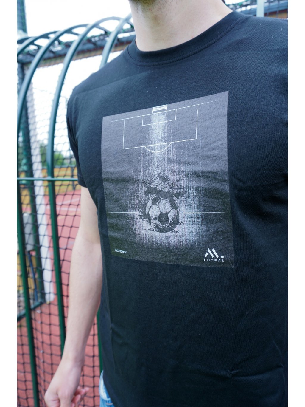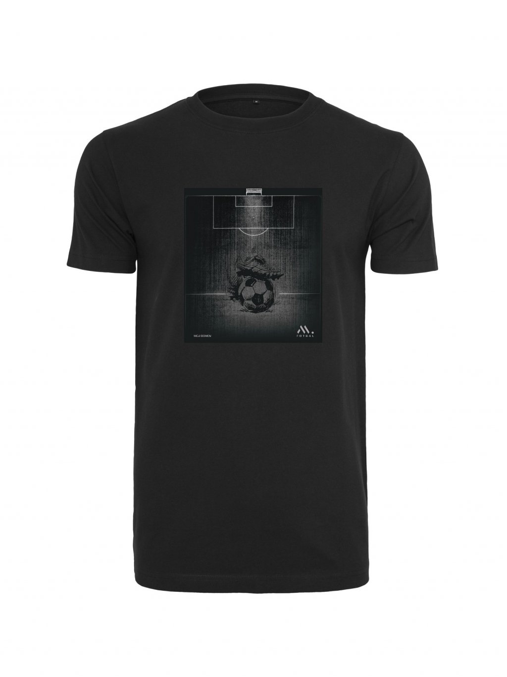 Černé tričko s potištěným motivem fotbalového hřiště s míčem a kopačkou. Vše doplňuje malý nápis MŮJ DOMOV. Triko je optimálním kouskem pro všechny fotbalové nadšence, pro které hřiště znamená domov.